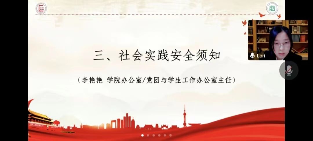 会议第三项,由学院办公室/党团与学生工作办公室主任李艳艳老师为大家作安全须知。李艳艳老师将“安全须知”分为两大部分,分别从出发前后进行叮嘱。实践开展前,学院团委及学术实践部、各位实践团队、各位实践团队的指导老师及队员、各位家长应各司其责,做好实践开展前各项事宜和准备工作,确保实践的顺利开展;实践开展中:各实践团队应做到保持信息畅通、注意保证人身安全、保证身体健康、保证财产安全、理智应对突发事件,与学院及时沟通等。最后,李老师表示,安全无小事,防患于未然。无危则安,无损则全。各实践团队和队员应按要求完成相关工作并注意安全防护,与学院、学校及家长保持密切联系,确保实践安全。