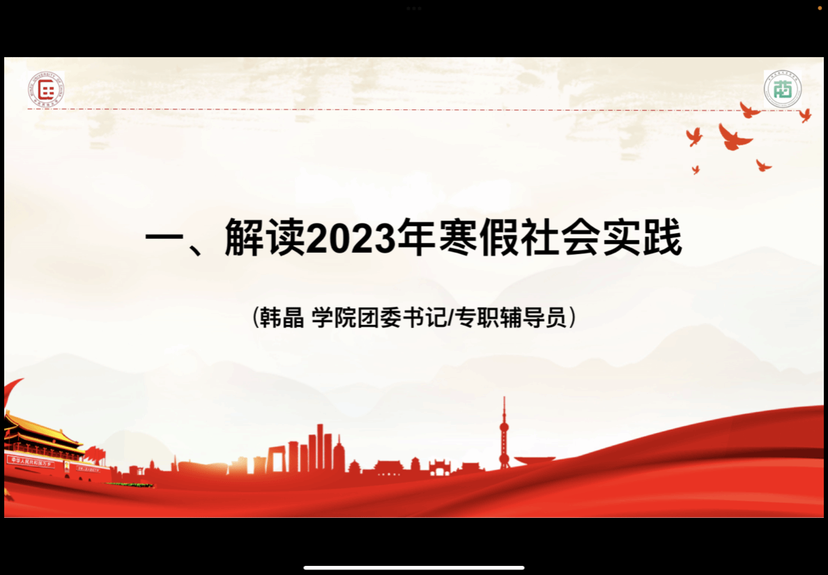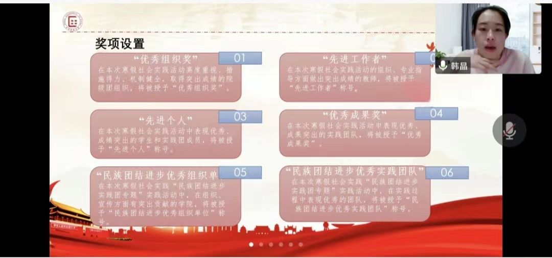会议第一项,学院团委书记/专职辅导员韩晶老师为大家解读2023年寒假社会实践相关要求及奖项设置。