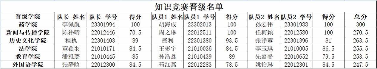 根据比赛规则:参赛队伍(一名队长、两名队员)通过学习通进行线上答题,按答题总成绩进行由高到低排序(若总成绩相同则采用答题总用时间排名),同一学院组队队伍中,本学院排名第一的前六个总成绩最高的队伍晋级决赛(跨学院组队无法晋级),本次初赛共有6支队伍进入决赛,现将名单公示如下: