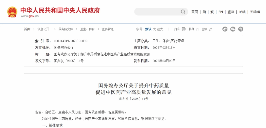 国务院办公厅印发的《关于提升中药质量促进中医药产业高质量发展的意见》明确指出,要推进中药科技创新,聚焦重大慢病等临床需求,研制一批临床疗效突出的中药创新药。