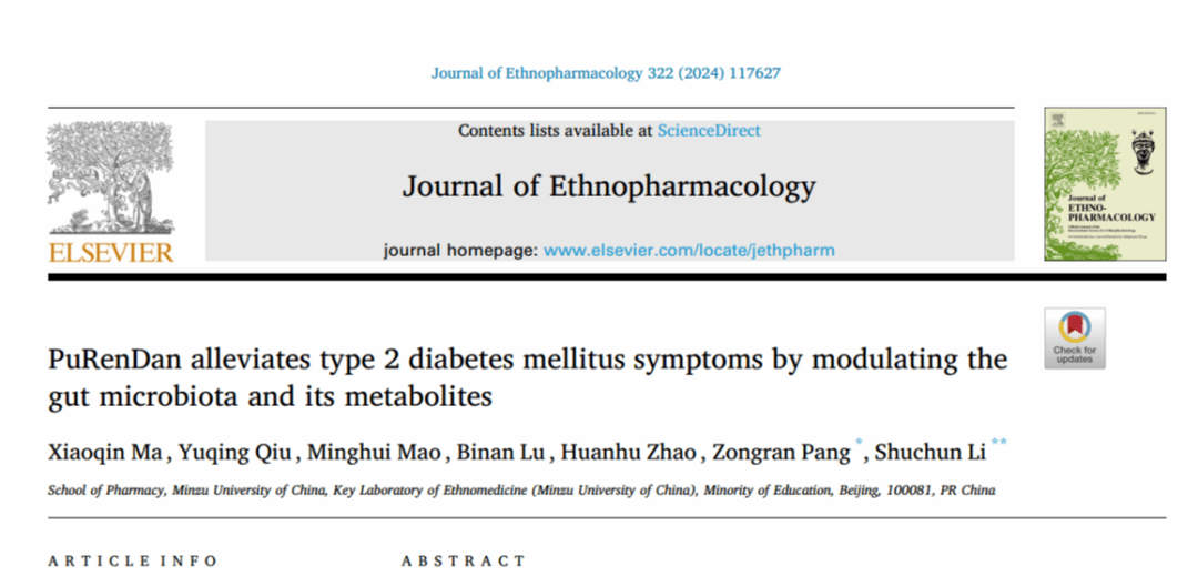 该团队在药理学专业期刊Journal of Ethnopharmacology上发表了题为“PuRenDan alleviates type 2 diabetes mellitus symptoms by modulating the gut microbiota and its metabolites”的最新成果。中药菩人丹(PRD)由苦瓜、人参、丹参、葛根和炙首乌五味药物组成。课题组前期研究表明,PRD可以降低大鼠的胰岛素抵抗和血糖水平,增强胰腺血流,改善胰岛β细胞结构与功能。然而,其治疗T2DM的主要机制尚不清楚。