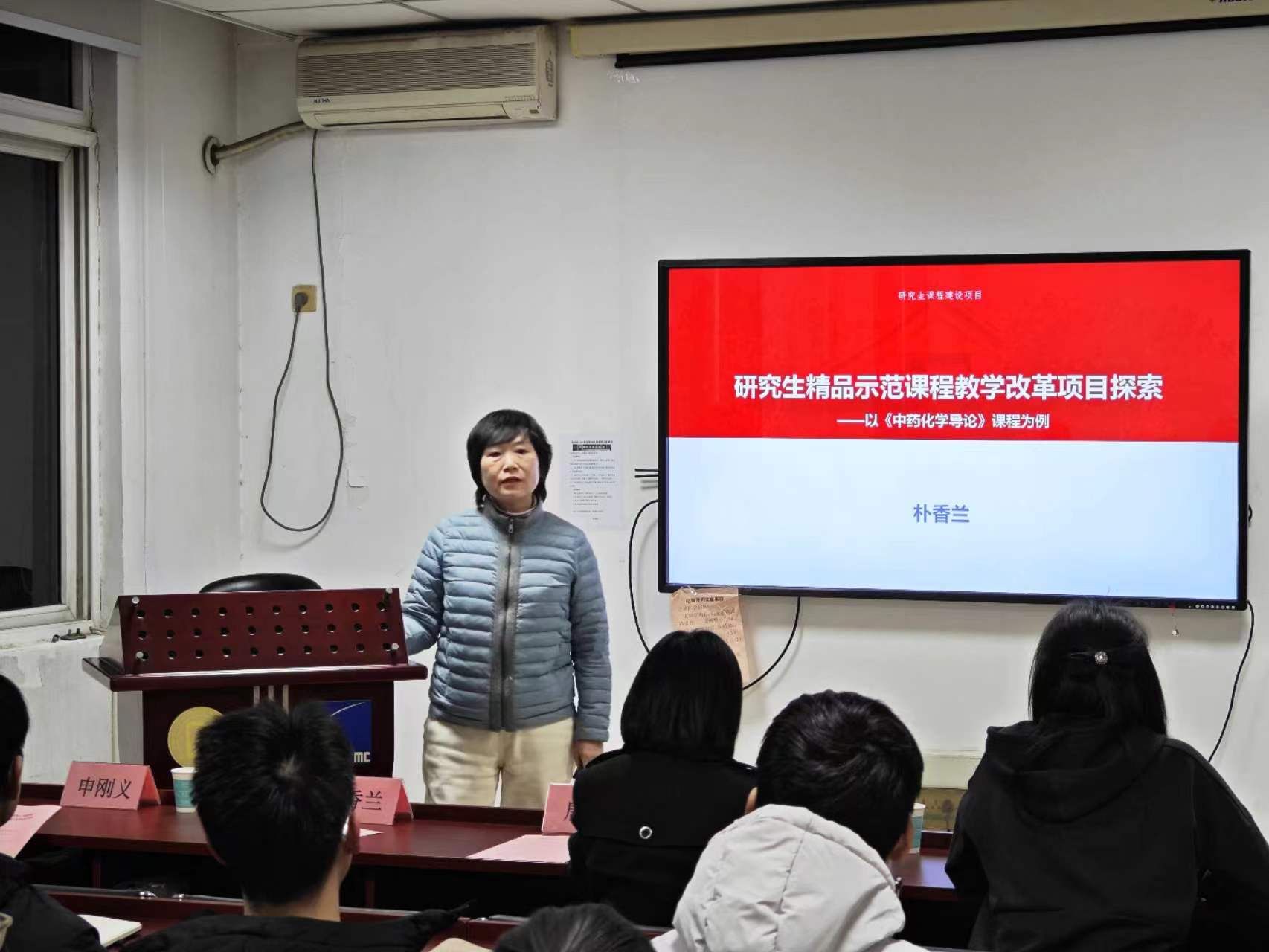 讲座上半场由朴香兰教授主讲,朴老师在讲座中分享了关于研究生精品示范课程教学改革项目的经验,以《中药化学导论》课程为例进行了深入探讨。她着重强调教育对国家兴盛的关键作用,教育的强弱直接关系到国家的强弱。朴教授提出了在教学内容、教学方法、综合素质培养以及教学管理等方面进行改革优化的思路。