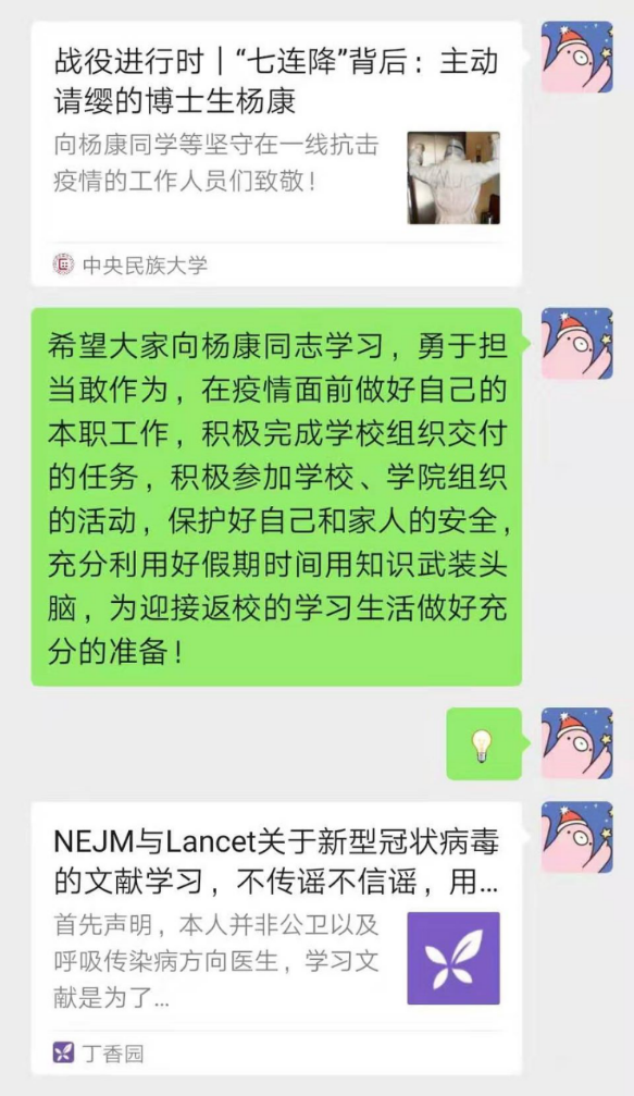 向杨康同学等坚守在一线抗击疫情的工作人员致敬,停课不停学,利用专业知识,积极开展疫情相关文献分享活动。