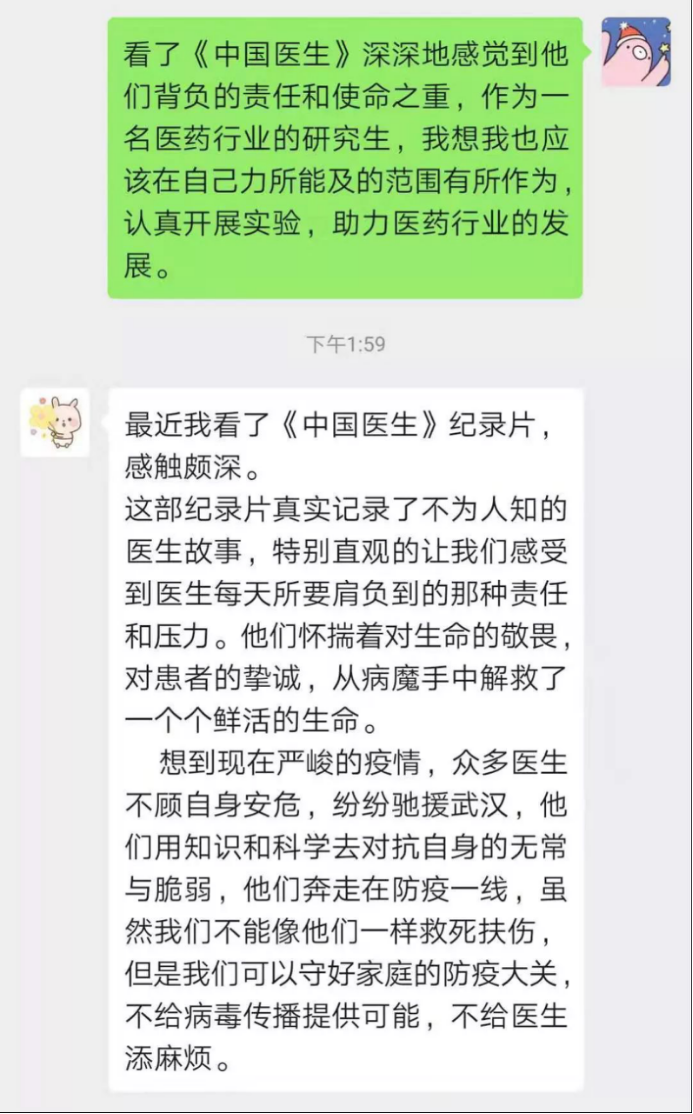 组织观看《中国医生》,开展线上交流“战疫情、守担当”。