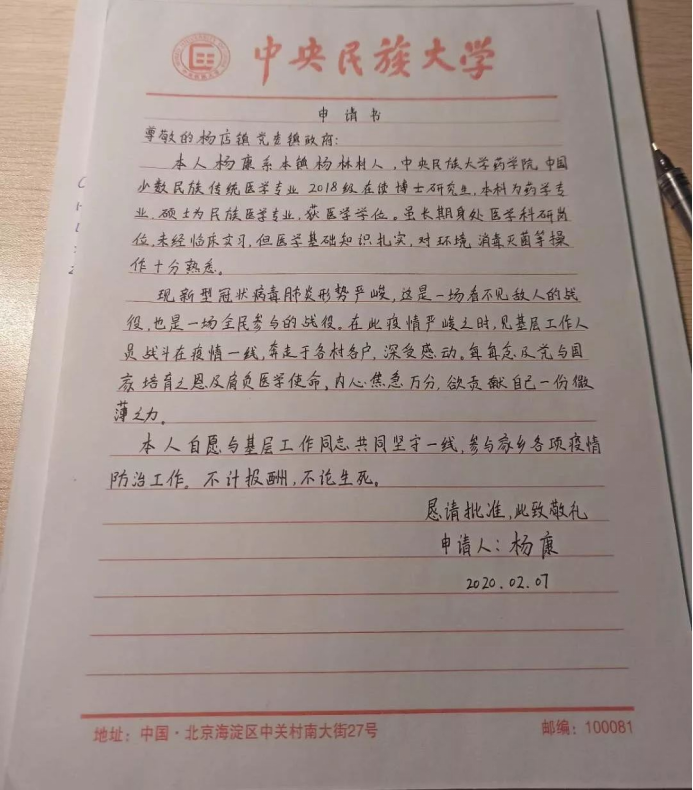 我支部杨康同志,一位土生土长的湖北省孝感市人。在新型冠状病毒引发的肺炎疫情爆发后,于2月7日主动请缨,次日即作为工作人员前往留观点留观点协助防疫工作。他说:“现新型冠状病毒肺炎形势严峻,这是一场看不见敌人的战役,也是一场全民参与的战役。在此疫情严峻之时,见基层工作人员战斗在一线,奔走于各村各户,深受感动。每每念及党与国家培育之恩及肩负医学使命,内心焦急万分,欲贡献自己一份微薄之力。本人自愿与基层工作同志共同坚守一线,参与家乡各项疫情防治工作,不计报酬,不论生死。”