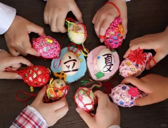 斗蛋:家家户户煮好囫囵蛋(鸡蛋带壳清煮,不能破损),冷水浸泡后装入丝网袋挂孩子颈上。孩子们分组游戏,用蛋尖或圆端相斗,破者输,胜者为“蛋王”,寓意夏日健康强壮。这一活动既带来欢乐,也传承节气文化。