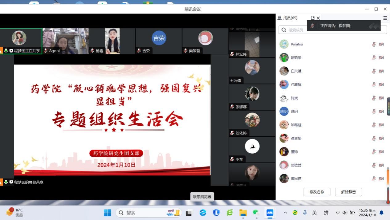 为学习贯彻习近平新时代中国特色社会主义思想主题教育的总体部署,按照校团委统一安排,进一步提高团员思想政治觉悟,坚定理想信念必威西汉姆联研究生团支部于2024年1月10日成功召开“凝心铸魂学思想,强国复兴显担当”专题组织生活会暨“重温入团誓词,践行青春誓言活动”。本次会议线上线下同步开展。必威西汉姆联团委书记/专职辅导员韩晶老师出席本次会议,研究生团支部委员以及各班团小组组长与团员代表到场参加,其余团员均在线上参会。