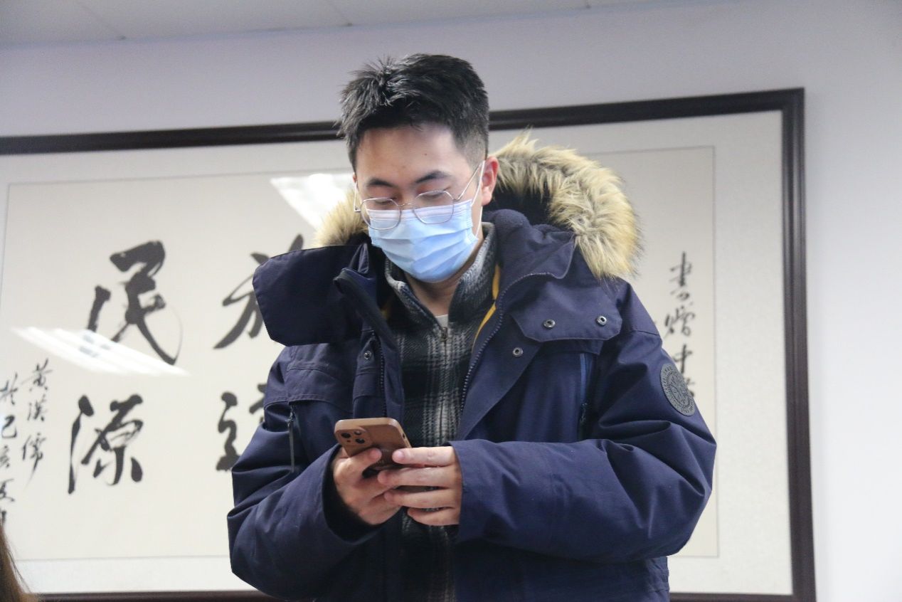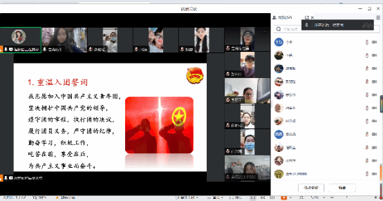 会议进入第二部分“重温入团誓词,践行青春誓言”活动,第一环节由研究生团支部组织委员程梦圆同学带领大家一起重温入团誓词。线上线下全体成员起立,面向团旗并举起右拳,用铿锵有力的声音宣读誓词,当年的决心与信念被重温、团意识被再次唤醒。在场的各位无不神情坚定、斗志昂扬。