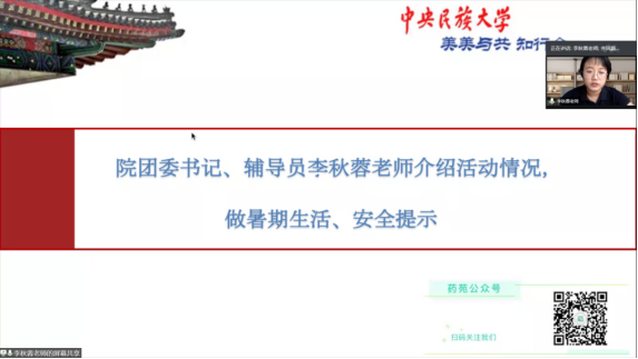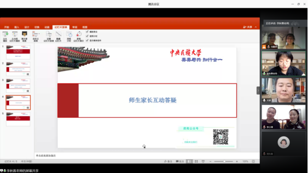 最后,师生家长互动答疑的环节,多位家长连线发言,场面热烈恳谈真切。两位老师了解到同学们在家学习、生活的情况,以及思想、心理的状态,解答了目前最关心关注的问题,例如考研的专业选择、考研的科目、考研资料的挑选等,表示会尽最大的努力助力同学们升学求职。多位家长纷纷表示:孩子高三毕业一个人到北京上学,说实话会不放心,今天看到两位老师的热情介绍分享,感到十分踏实亲切,特别感谢学校和学院各位老师长期以来对孩子们的关爱和培养。