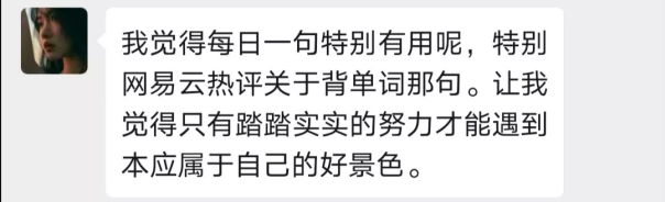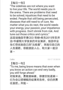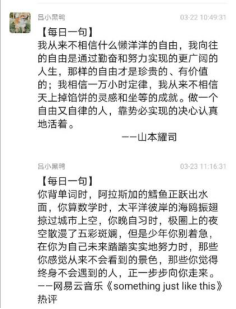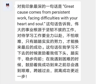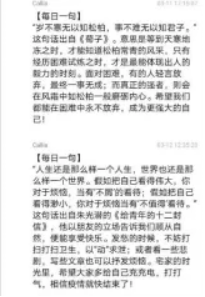 17级制药班班长肖鹏君同学想到了【每日一句】这个活动。从3月8日起,在班群每天带头分享一句话,内容或是激人上进名人名言,或是某本书中让人难以忘怀的一段话,亦或是一段双语赏析,让我们在思考的同时还提高了英语阅读能力。