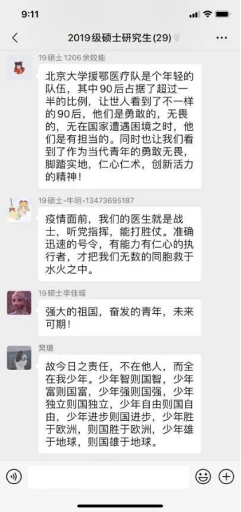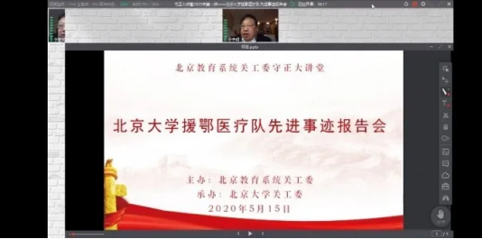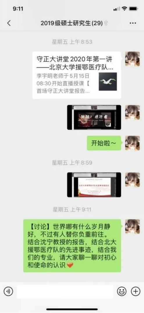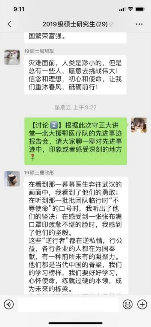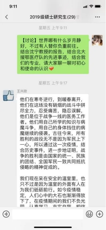 为深入弘扬援鄂抗疫精神,发挥榜样作用,凝聚青年力量,贯彻落实市委教育工委、关工委对于抗疫第一课的组织要求,响应校团委“使命在肩,奋斗有我”用奋斗书写青春的主题团日活动号召,5月15日9:00-11:00,必威西汉姆联2019级硕士班班长组织班内全体同学认真观看报告会直播,通过群内讨论、观看感想等形式,积极讨论如何学习发扬北京大学援鄂医疗队的青年榜样事迹。