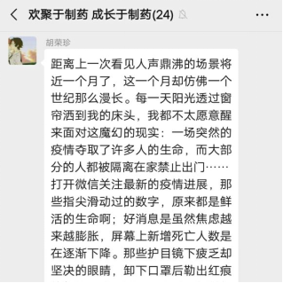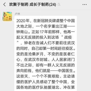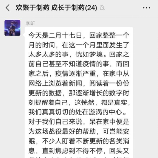 2016级制药工程班全体同学积极配合学校及学院的工作安排,每日主动、及时反馈个人状况,线上接龙承诺书,观看《老师请回答》特别节目,观看《中国医生》纪录片。在此基础上,召开“讲好中国故事,致敬中国医生”线上主题班会。一个班为一个团支部,此次班会也是团日活动的重要载体。