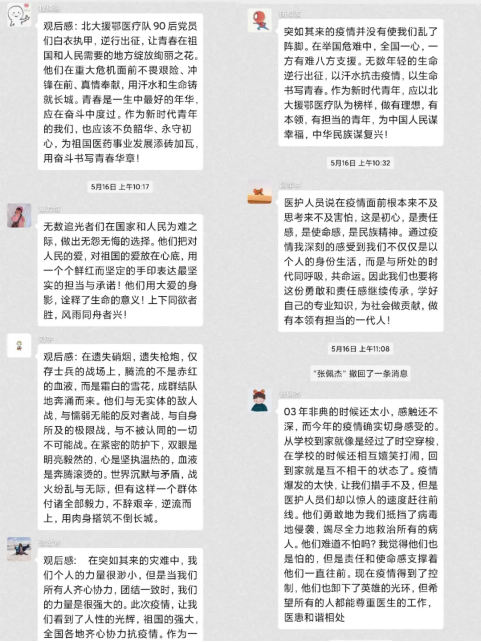 班长郭艳茹表示,这次疫情,就像一面镜子,照出勇敢与懦弱,照出责任与担当。北大援鄂医疗队“90后”党员们用自己的青春担当赢得了习近平总书记和全国人民的赞叹。“青年一代有理想,有本领,有担当,国家就有希望,民族就有未来。”我们应该把总书记对我们青年的谆谆教诲时刻牢记于心。北大援鄂医疗队的先进事迹启示我们,只有自觉将个人理想与国家民族复兴的命运紧密结合,在艰难困苦中历练、奋斗,为人民谋幸福,我们新时代的大学生才能真正成长为中国的“脊梁”,并最终实现人生价值。