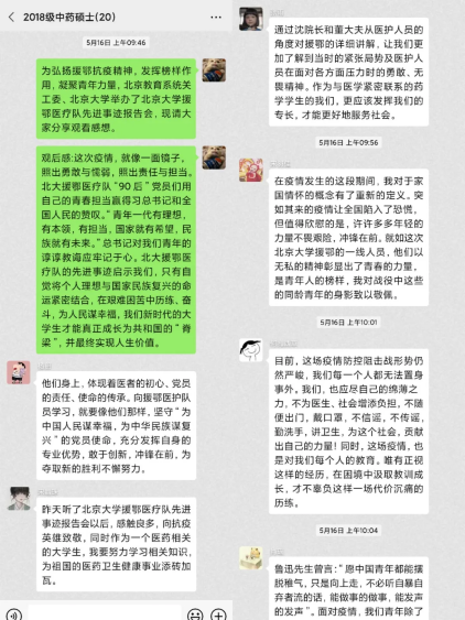 2020年5月15日必威西汉姆联2018级中药硕士班组织全班同学一同在线上观看了由北京教育系统关工委、北京大学在线举办的北京教育系统关工委守正大讲堂——北京大学援鄂医疗队先进事迹报告会。同学们认真观看了报告会,并被北大援鄂医疗队青年们的精神与事迹所感动鼓舞,纷纷在观看完报告会后积极分享了自己的感想。