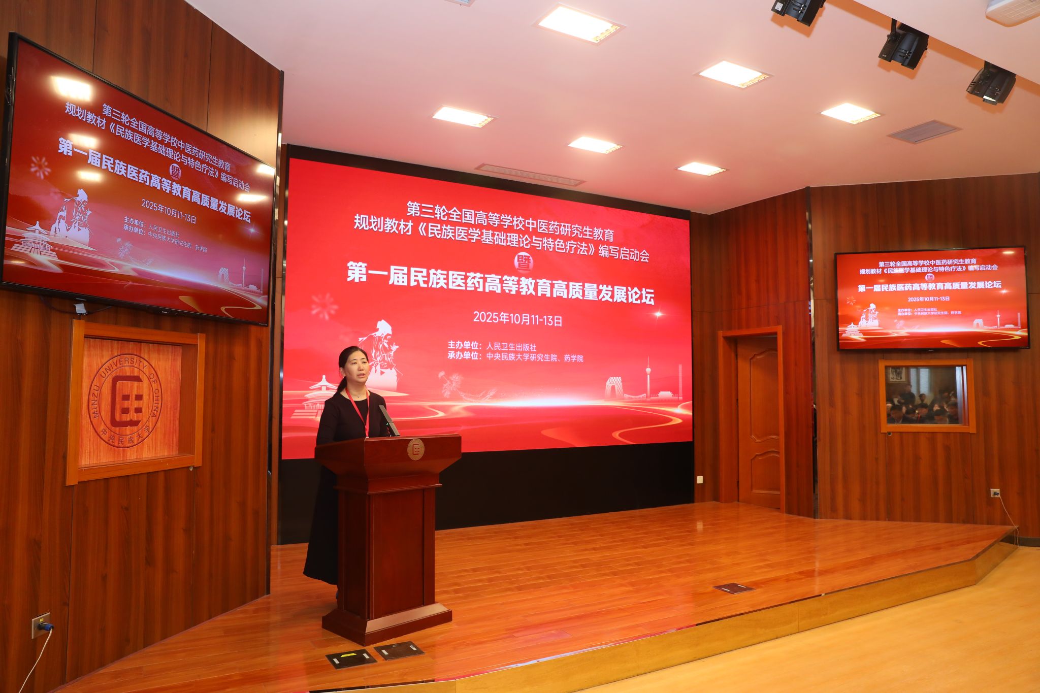 2025年10月12日,由人民卫生出版社主办,BETWAY必威研究生院、必威西汉姆联承办的第三轮全国高等学校中医药研究生教育规划教材《民族医学基础理论与特色疗法》编写启动会暨第一届民族医药高等教育高质量发展论坛在BETWAY必威海淀校区隆重召开。中国民族医药学会会长苏钢强,BETWAY必威党委常委、副校长马林涛、甘明刚,人民卫生出版社中医药中心主任、人卫西南分社董事长张科,人民卫生出版社中医药中心编审周玲,BETWAY必威发展规划处处长、国际合作处处长张焰,以及教材主编、必威西汉姆联院长庞宗然教授领衔的23位编委专家出席会议,必威西汉姆联领导班子和师生代表参会。会议开幕式由BETWAY必威党委常委、研究生院院长赵丽芳主持。